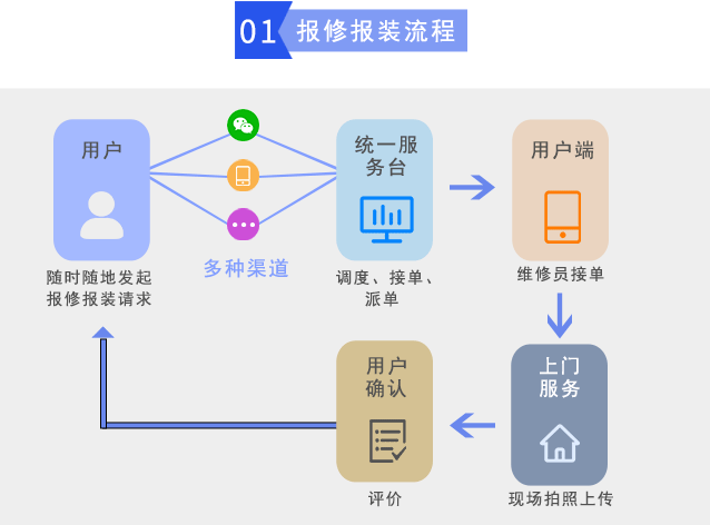 在線(xiàn)報(bào)修報(bào)裝系統(tǒng),可幫助企業(yè)實(shí)現(xiàn)輕松、規(guī)范、細(xì)致的報(bào)修、派單、接單、維修報(bào)裝、評(píng)價(jià)等一體化管理工作,提高管理效率、實(shí)時(shí)掌握、準(zhǔn)確、全面的報(bào)修報(bào)裝進(jìn)度,高效控制報(bào)修報(bào)裝全部過(guò)程。